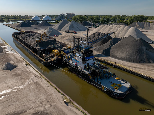 The tug Sharon M I, pushing the barge Huron Spirit, arrived on the Saginaw River early Tuesday morning and backed into the slip at Port Fisher in Bay City to unload for Bay Aggregates. Photos taken 7/22/25 and captured in accordance with all FAA regulations and airspace restrictions.